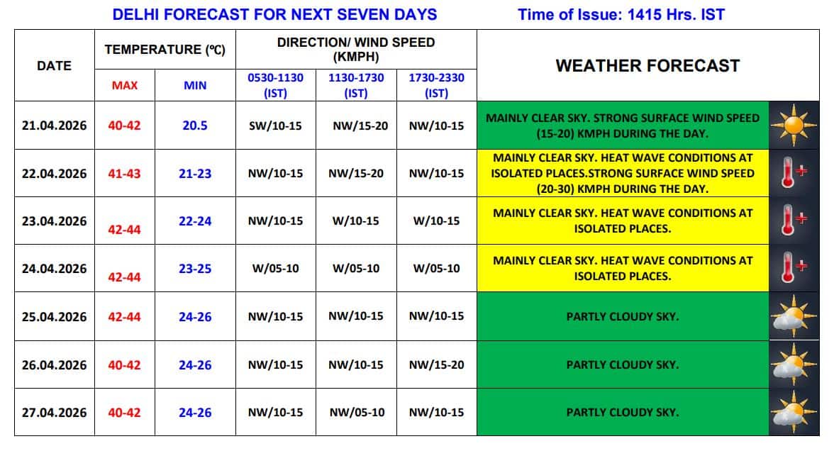 According to the India Meteorological Department (IMD), a continuous heatwave alert has been issued from April 21 to April 24. On April 21, the maximum temperature in Delhi was recorded at 41 degrees Celsius, while the minimum stood at 23 degrees. The situation is expected to worsen over the next few days, with temperatures likely to rise further. The maximum temperature may touch 43 degrees Celsius on April 22 and 23, and similar conditions are expected to persist on April 24, with the minimum temperature hovering around 24 degrees.