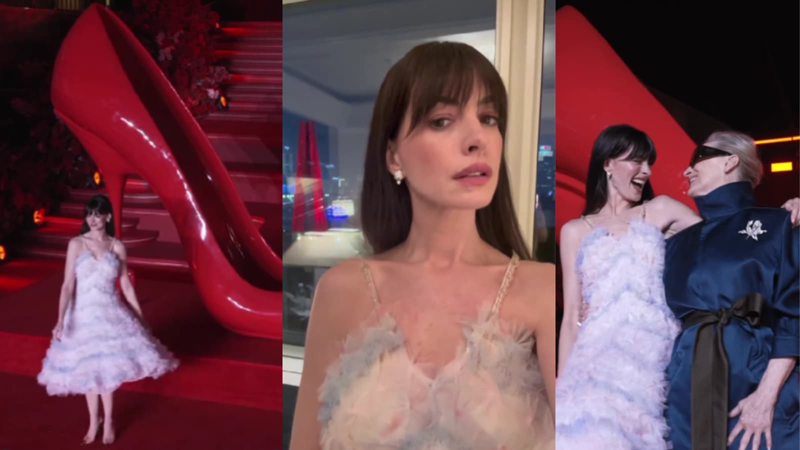 In the latest appearance in Shanghai, China on April 10, Anne radiated elegance in a white-blue, ultra-feminine unique ruffled gown that appeared to be from the same dreamy aesthetic. The dress featured intricate, multi-layered tulle and feather-like ruffles throughout the skirt, giving it a soft, cloud-like silhouette that floated beautifully.