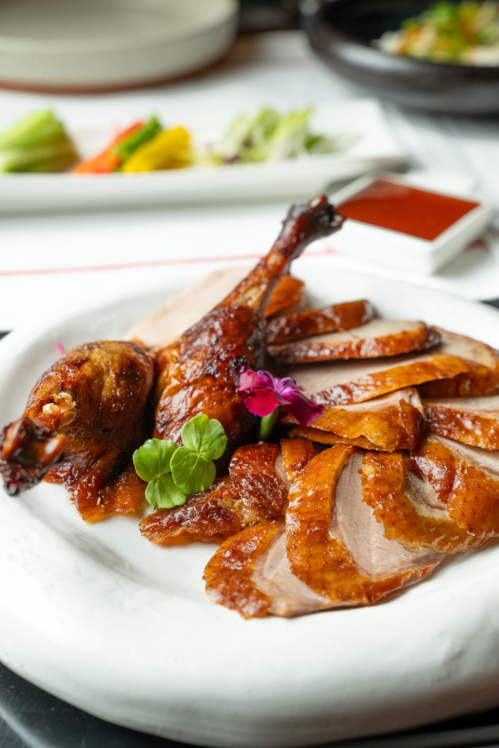 Live Carving Station – 18-Hour Slow-Roasted Peking Duck The centrepiece of the afternoon: a whole Peking duck, marinated for 24 hours in fragrant Asian herbs and slow-roasted for 18 hours to achieve crispy skin and tender, succulent meat. Carved live and served with soft mantao buns, hoisin sauce, and traditional condiments, this is festive indulgence redefined.