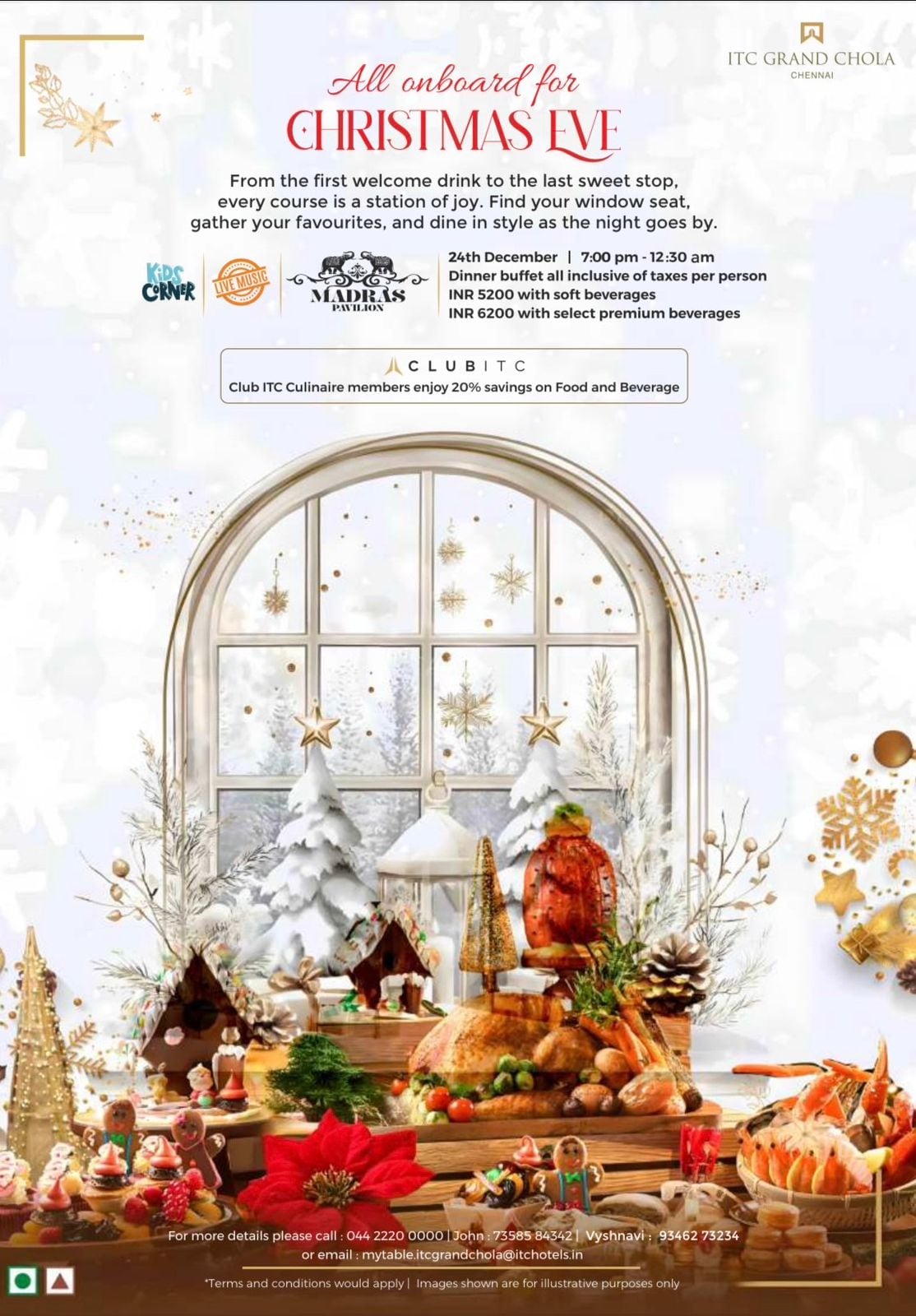 Madras Pavilion’s Christmas Eve Dinner invites guests to an immersive festive journey where every course feels like a station of celebration. Live music, an expansive buffet, and thoughtful festive décor set the stage for a joyful evening. On Christmas Day, the experience evolves into a multi-kitchen brunch across ITC’s signature restaurants, delivering a seamless blend of flavour, luxury, and festive cheer.