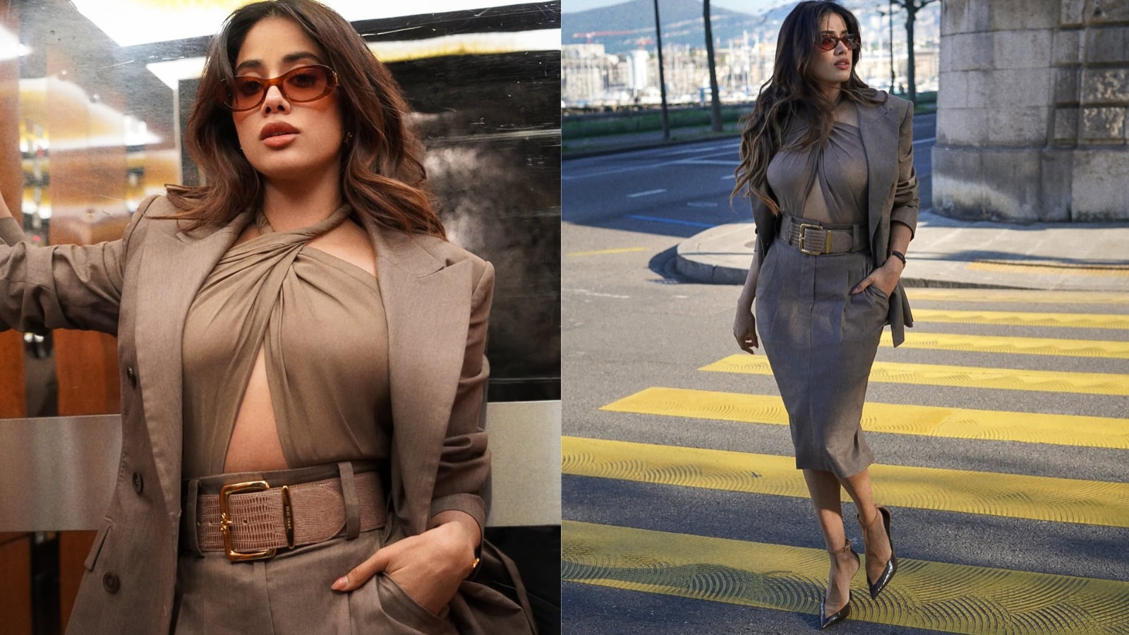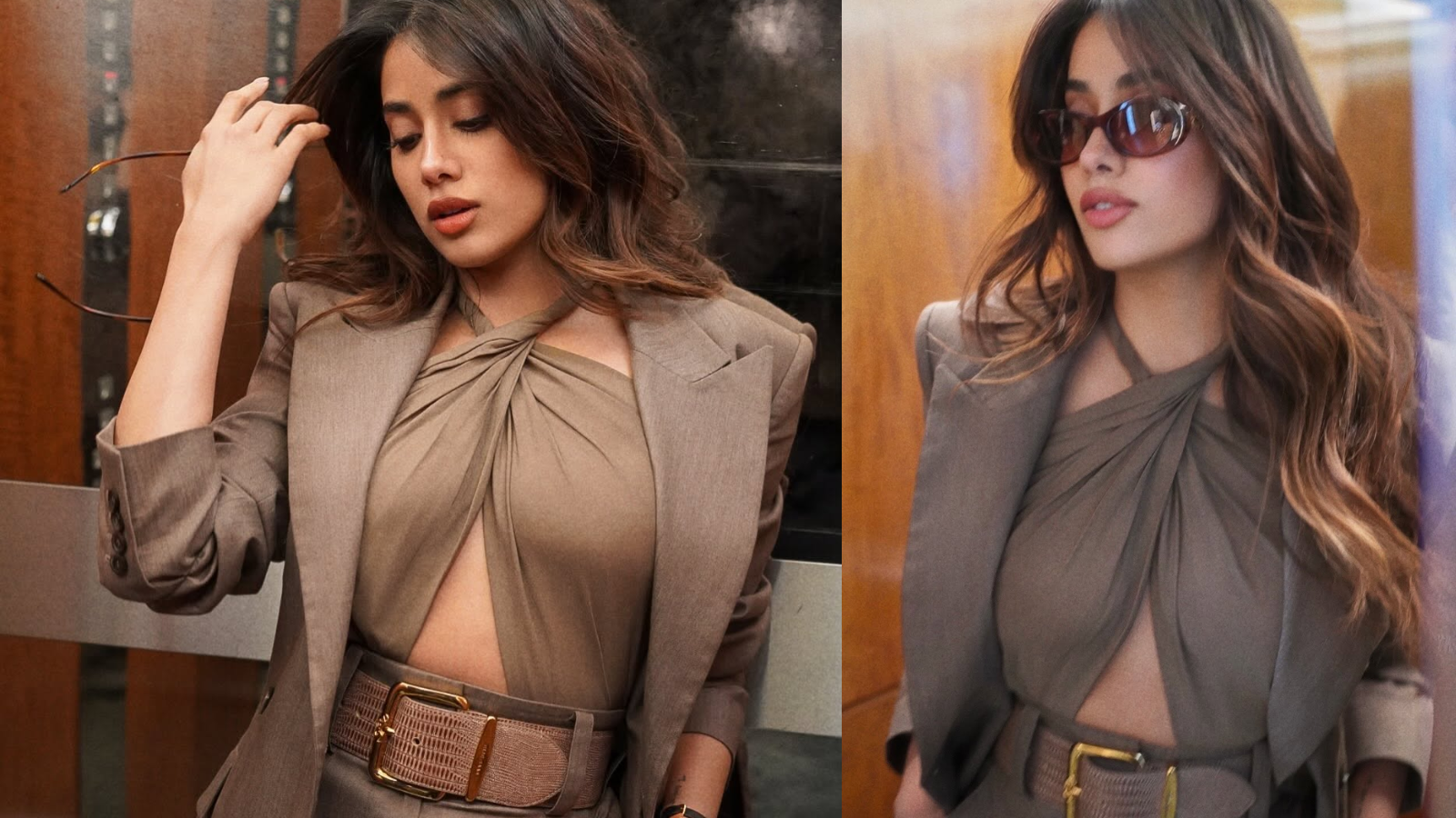 Janhvi wore a sleek taupe-toned monochrome look featuring a sharply structured blazer with strong shoulders and a clean, elongated silhouette. She paired it with a soft halter-style wrap top that featured elegant draping and a sculptural twist at the neckline, subtly revealing a hint of midriff.