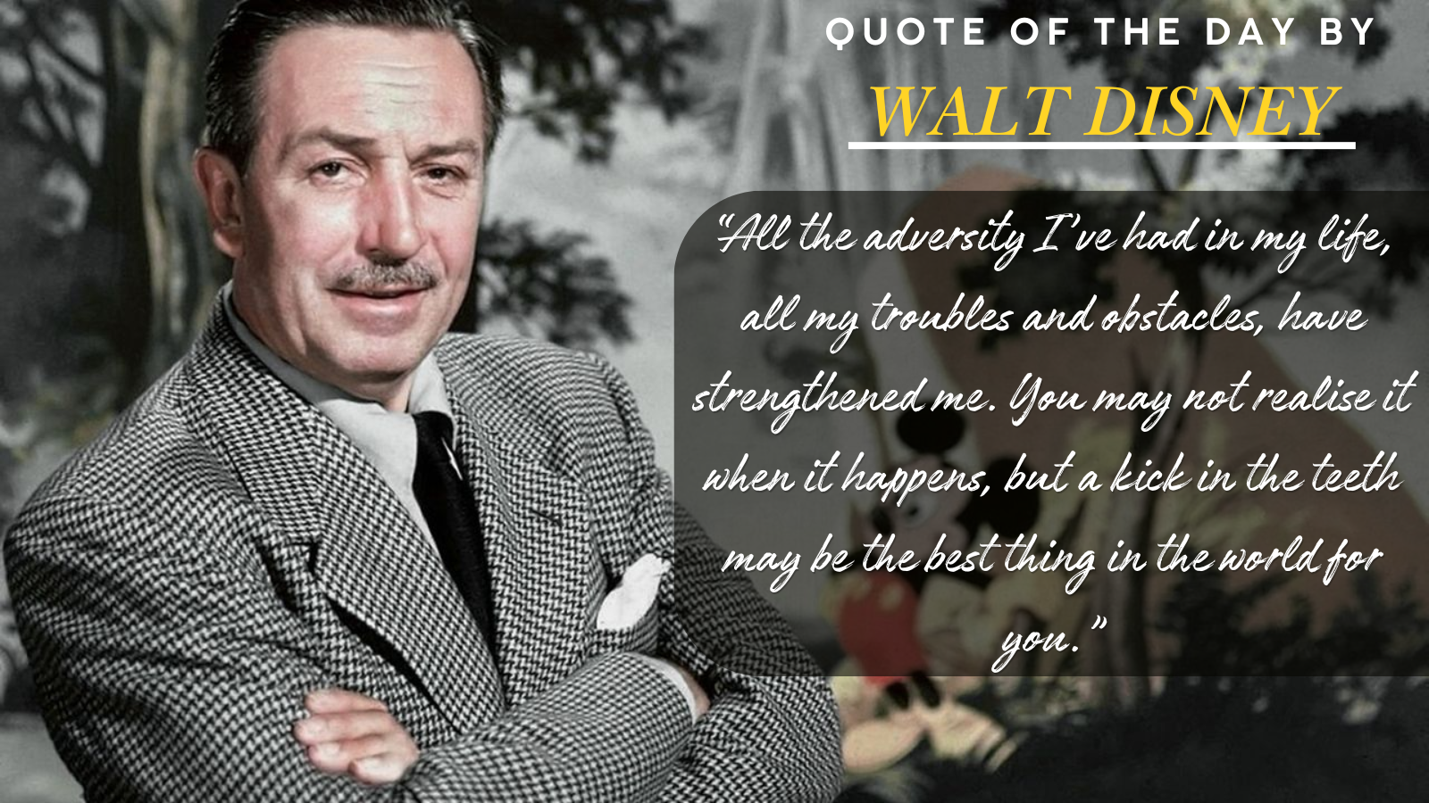Quote Of The Day By Walt Disney: “All the adversity I’ve had in my life, all my troubles and obstacles, have strengthened me. You may not realise it when it happens, but a kick in the teeth may be the best thing in the world for you.”