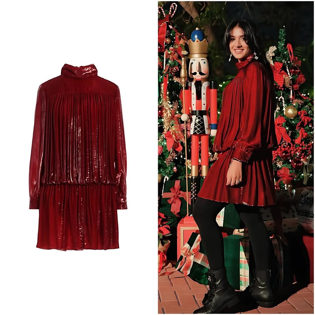 In a crimson minidress with sequins from the high-end fashion brand Celine, Radhika amplified the festive vibe for her second appearance. With its pleated features and high neckline, this dress was both beautiful and whimsical, making it ideal for the festive occasion. In order to achieve the ideal mix between comfort and style, she accessorised the outfit with stylish black ankle boots and opaque black tights.