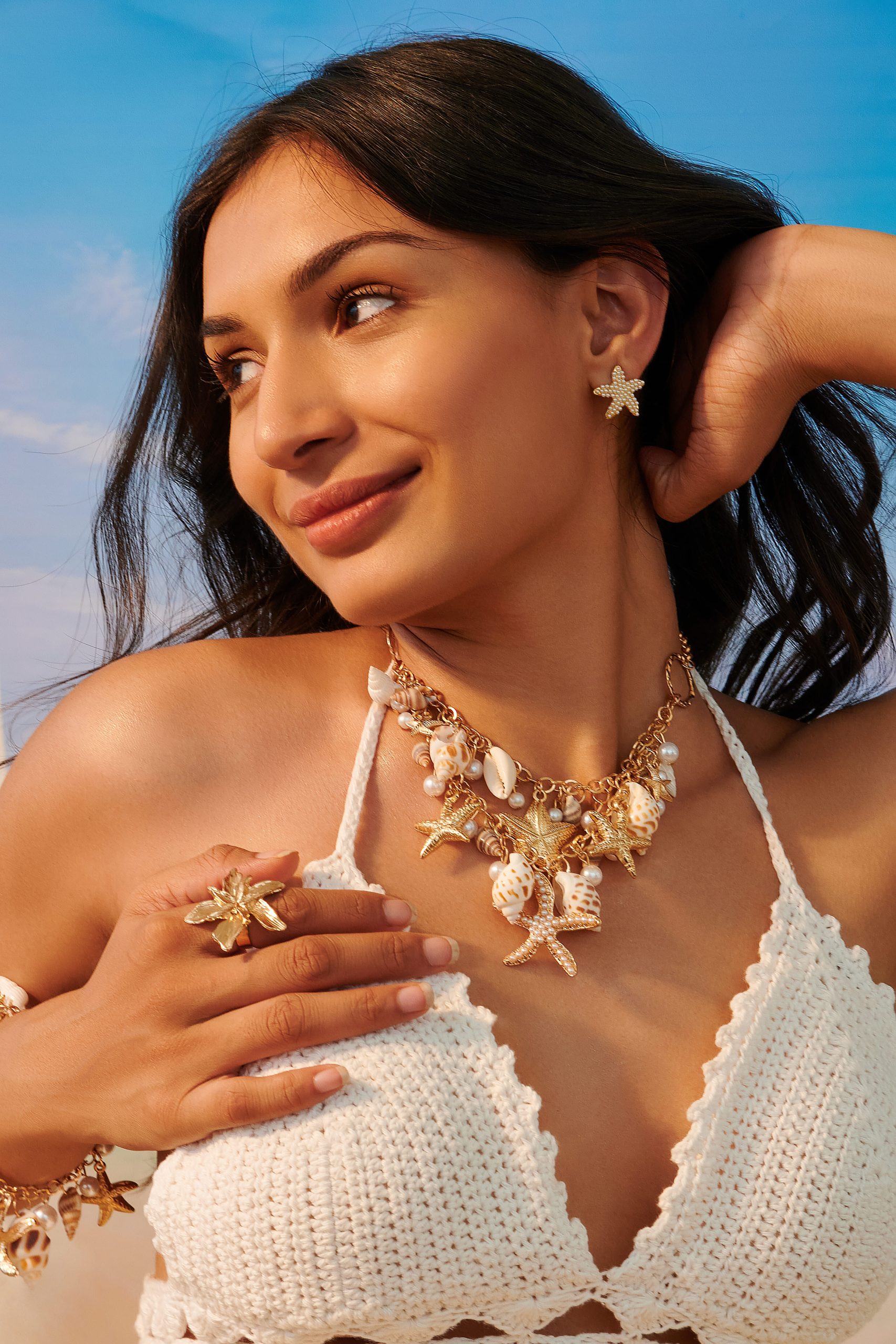 Lunaar Gold Seashells Necklace: This gold-toned seashell statement necklace showcases intricately detailed shell elements arranged in a bold, layered composition.