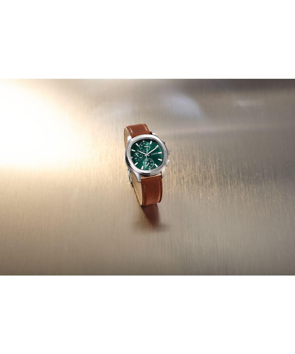 Palmer – A refined timepiece featuring a 40 mm polished recycled steel case paired with a sunray multi-function dial, complete with pushers and subtle striping detail. Finished with a smooth LWG-certified leather strap, it blends conscious craftsmanship with everyday sophistication.