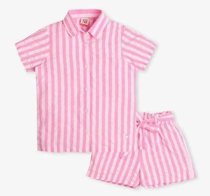 Girls Striped 3-Piece Co-ord Set (Pink): A breathable cotton three-piece co-ord set designed for comfort, layering, and versatile summer styling. Crafted in soft cotton with cheerful pink stripes, it offers ease of movement and all-day comfort.