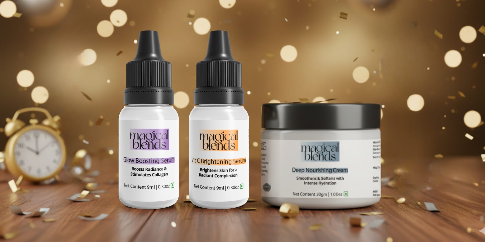 Glow Boosting Serum (Niacinamide) for brightness and smoothness, Vitamin C Brightening Serum for overnight radiance, Deep Nourishing Cream with shea and cocoa butters for winter hydration.