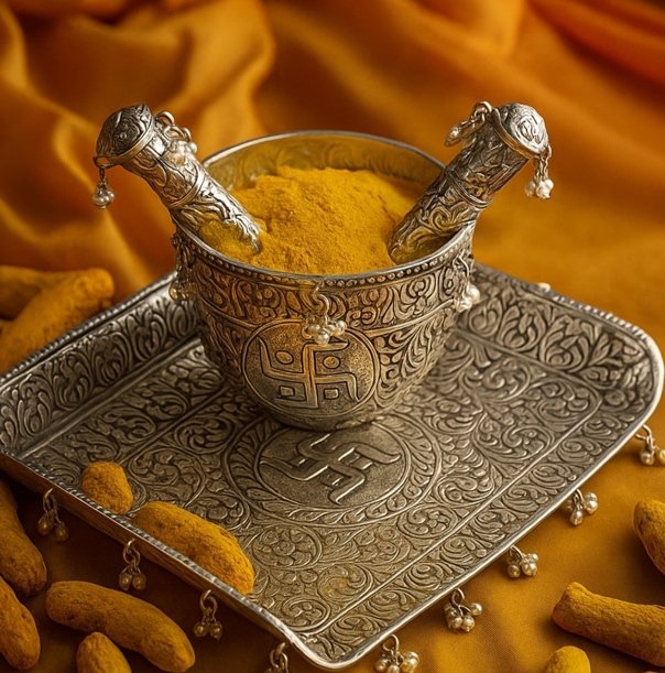 A beautifully handcrafted traditional set often used in Indian wedding ceremonies, especially for preparing and presenting haldi paste. Symbolising purity and auspicious beginnings, its intricate engravings and lustrous finish make it both functional and ornamental, a meaningful wedding gift or décor piece. Price: On request