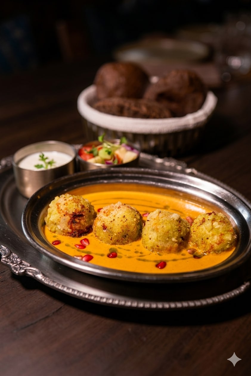 This immersive Navratri experience presents a wholesome thali featuring dishes like makhana galouti, kofta-e-khas, samak, and festive desserts like anjeer akhrot halwa.